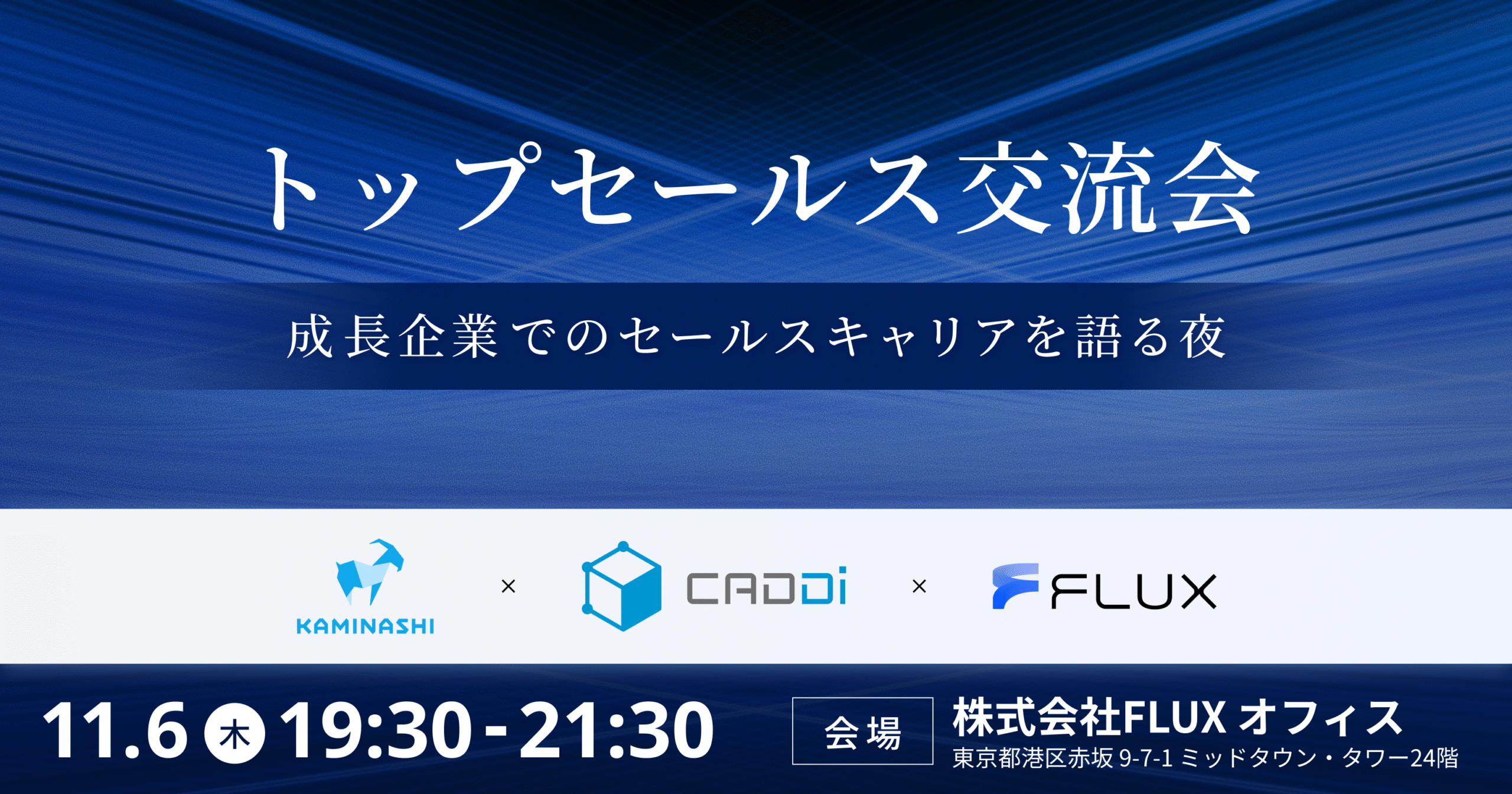 今回は、製造業×AIで業界の変革を目指す「キャディ」、現場DXのリーディングカンパニー「カミナシ」、AIトランスフォーメーションを推進する「FLUX」がタッグを組み、“セールスキャリアを加速させる” リアルイベントを開催します。